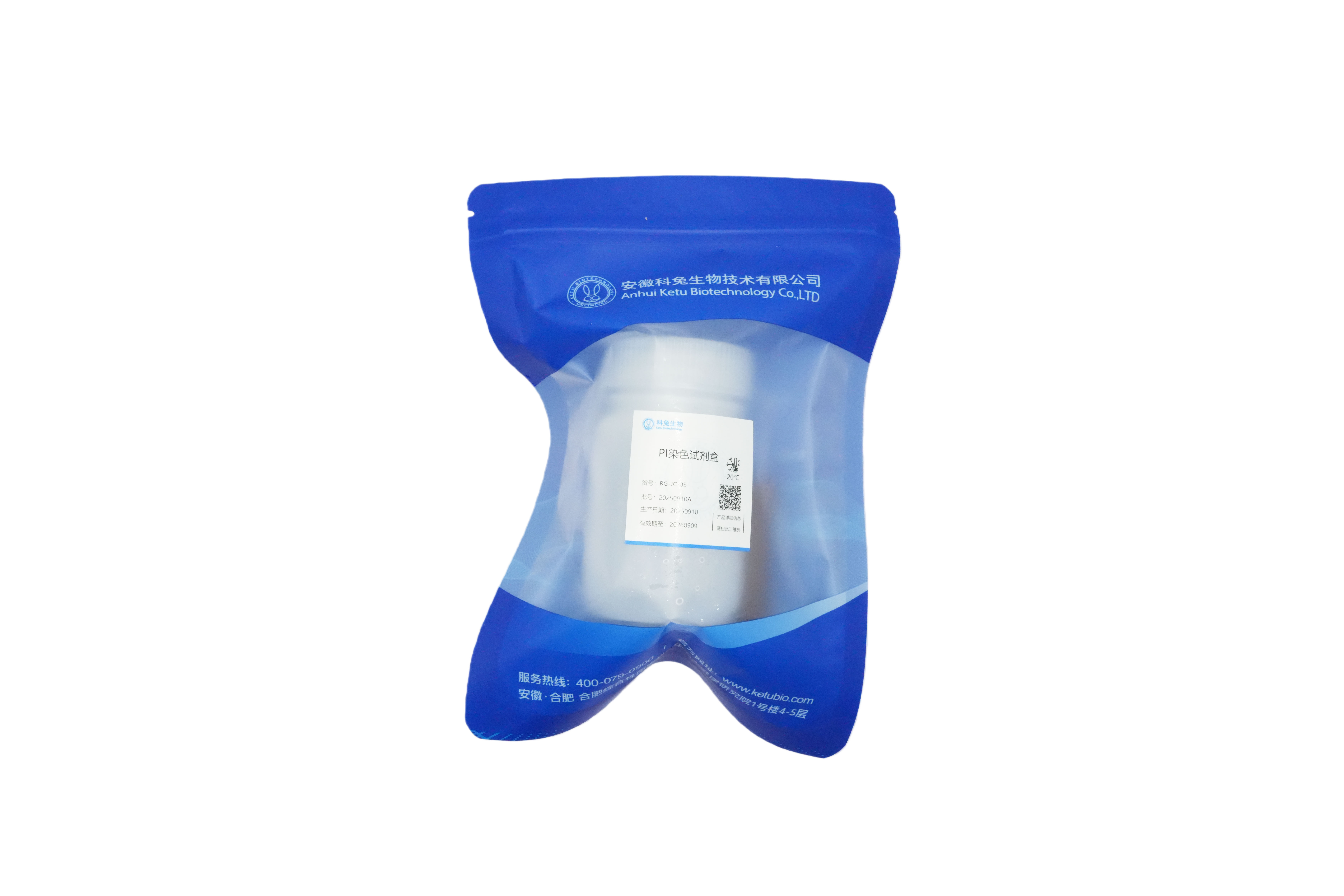 碘化丙啶(Propidium Iodide,PI)是一种常用的细胞核荧光染料,作为一种溴化乙锭(EB)的类似物,能够嵌入碱基 对之间实现与双链DNA结合。PI经488 nm荧光激发,产生相对较大的斯托克司频移后,并在617 nm处具有最大发射波长。 另外,PI不能穿透细胞膜而被排斥在活细胞外,但是可以穿过破损的细胞膜而对核染色。利用以上特性,PI可作为细胞活力分析的荧光探针之一。不仅可单独使用;也可以同Calcein-AM、Hoechst 33258或 Hoechst 33342等活细胞荧光探针一起使用,同时对活细胞和死细胞染色和鉴定。也能够与488 nm激发的荧光素如FITC和PE等联合使用。