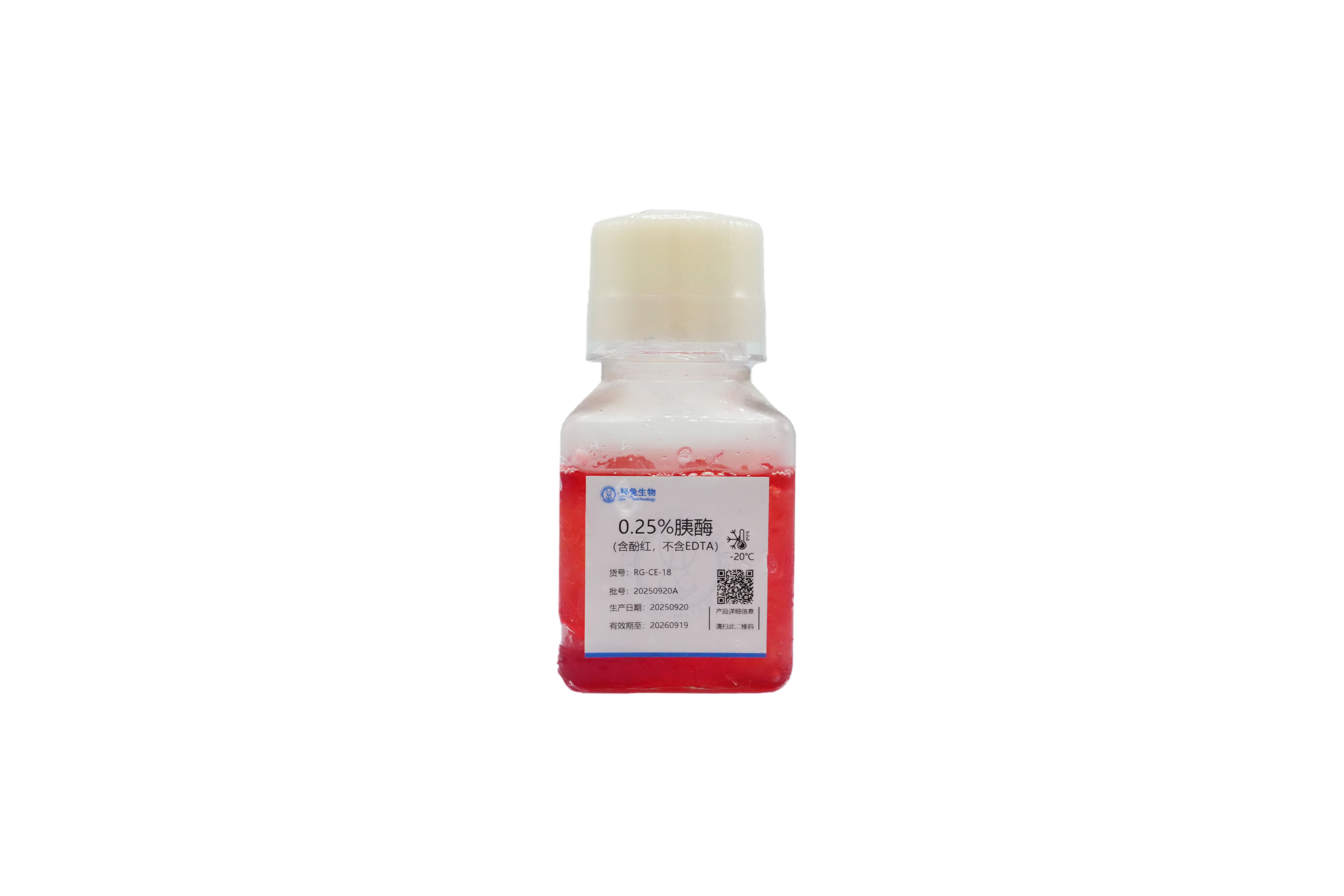 0.25%胰酶(含酚红,不含EDTA)含有0.25%胰酶和酚红,经过滤除菌,可直接用于细胞及组织消化。具有方便快速的特点,通常室温消化1分钟左右就可以消化下大多数贴壁细胞。